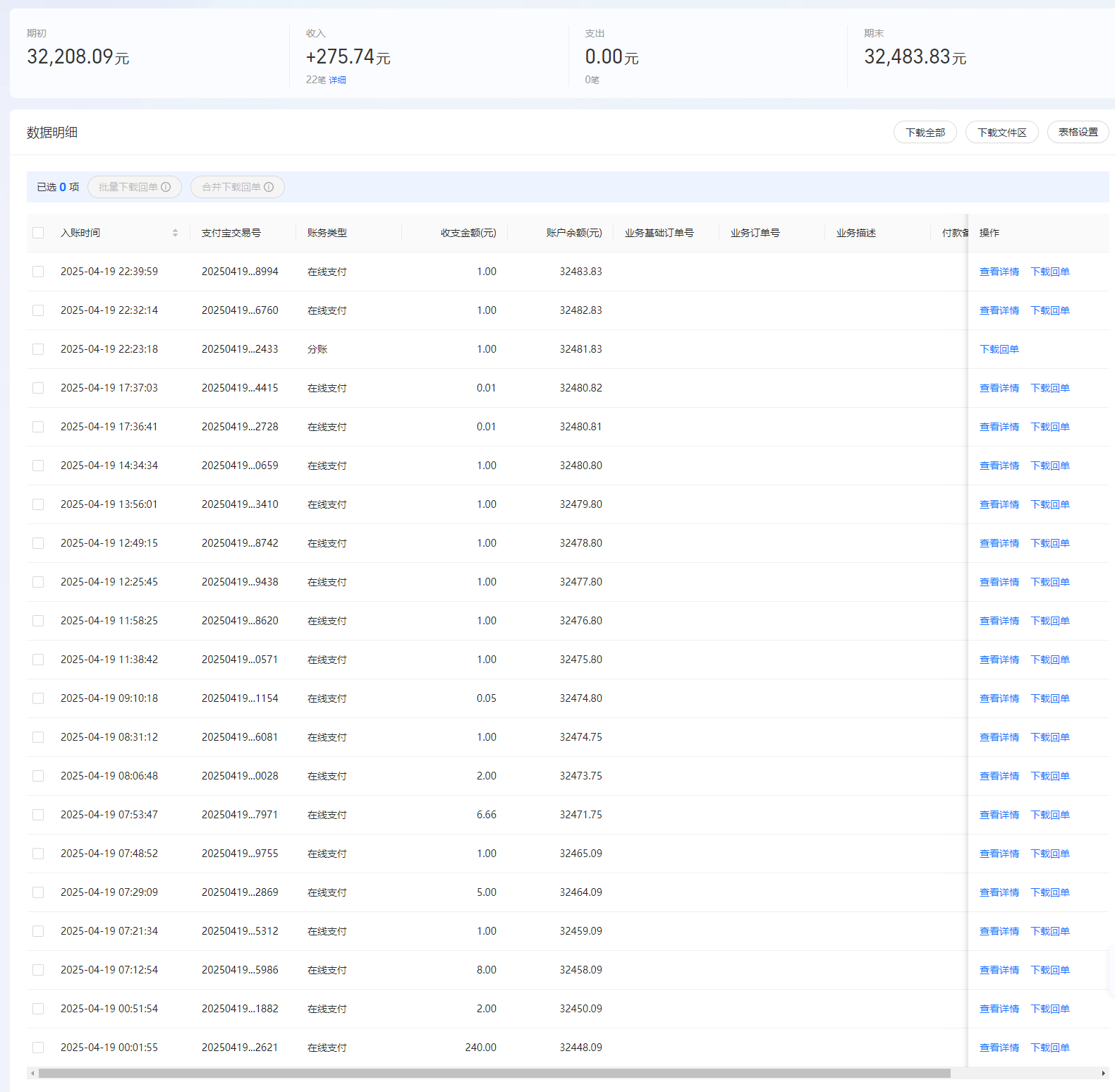 | 4月19日收到 | 支付宝(中国)网络技术有限公司 | 爱心助学 | ¥0.21 | 商家提现 |