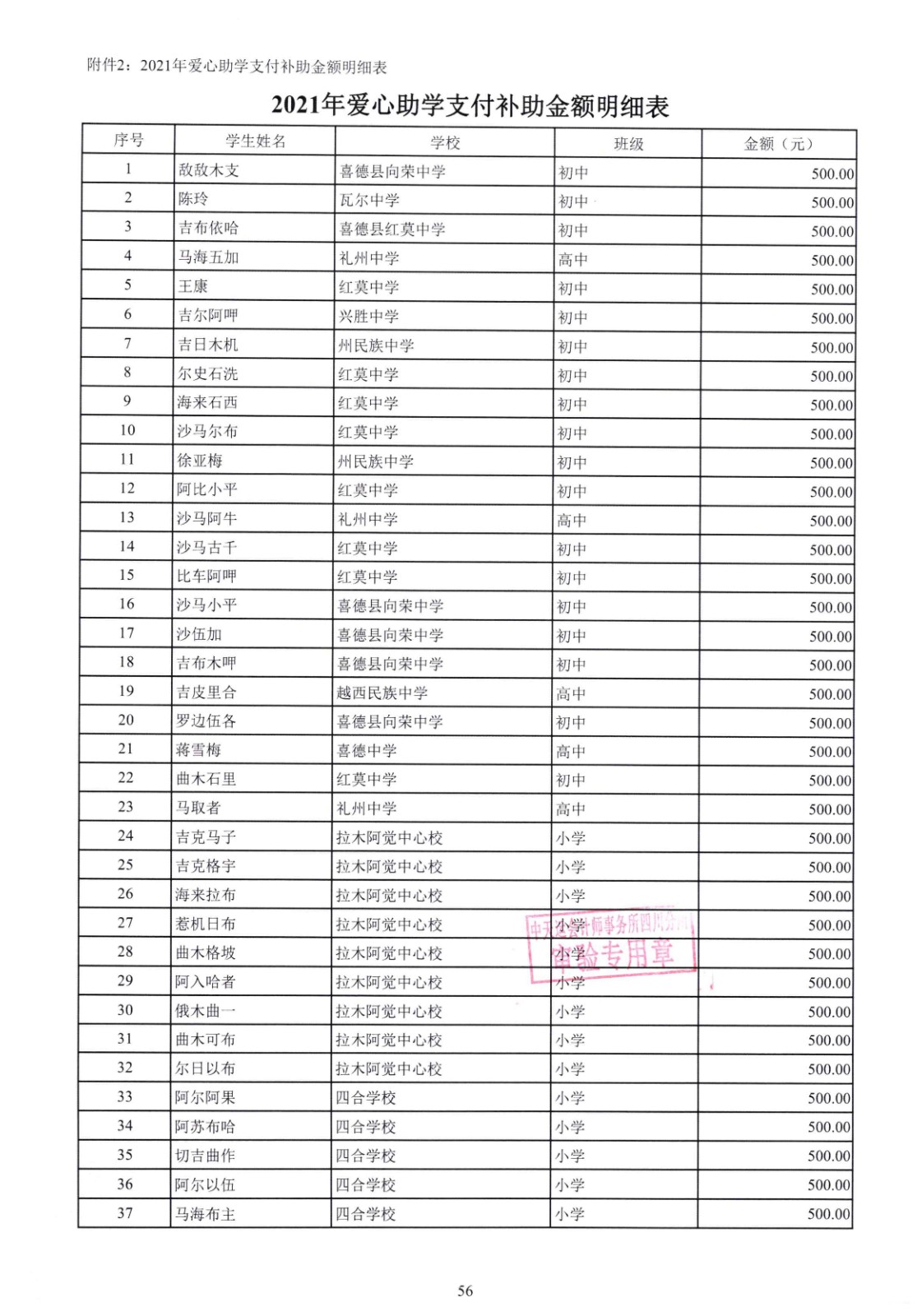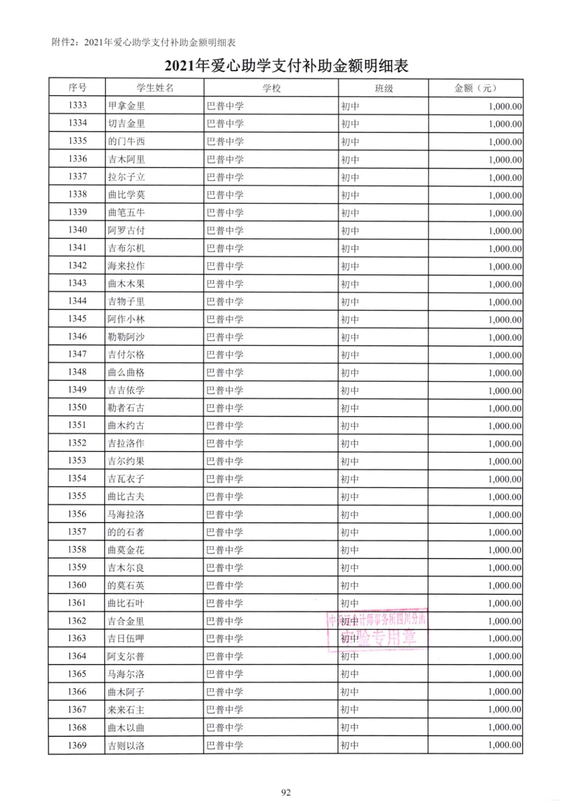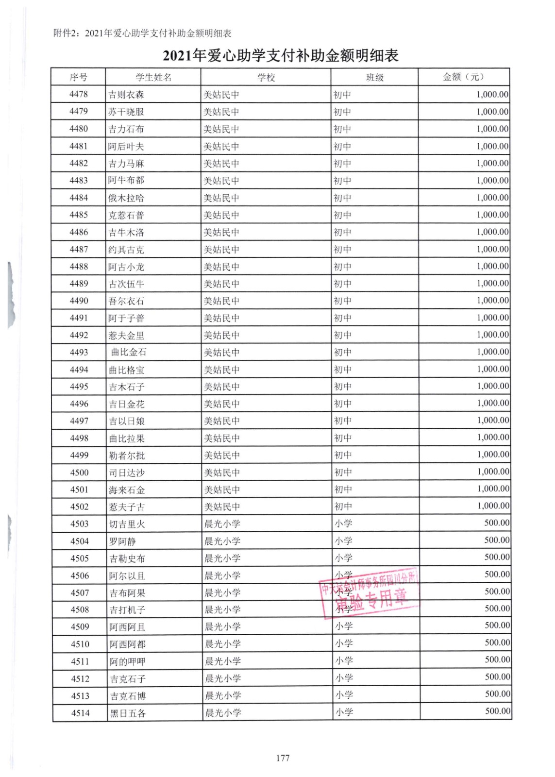 四川省索玛慈善基金会2021年爱心助学收支明细专项审计报告