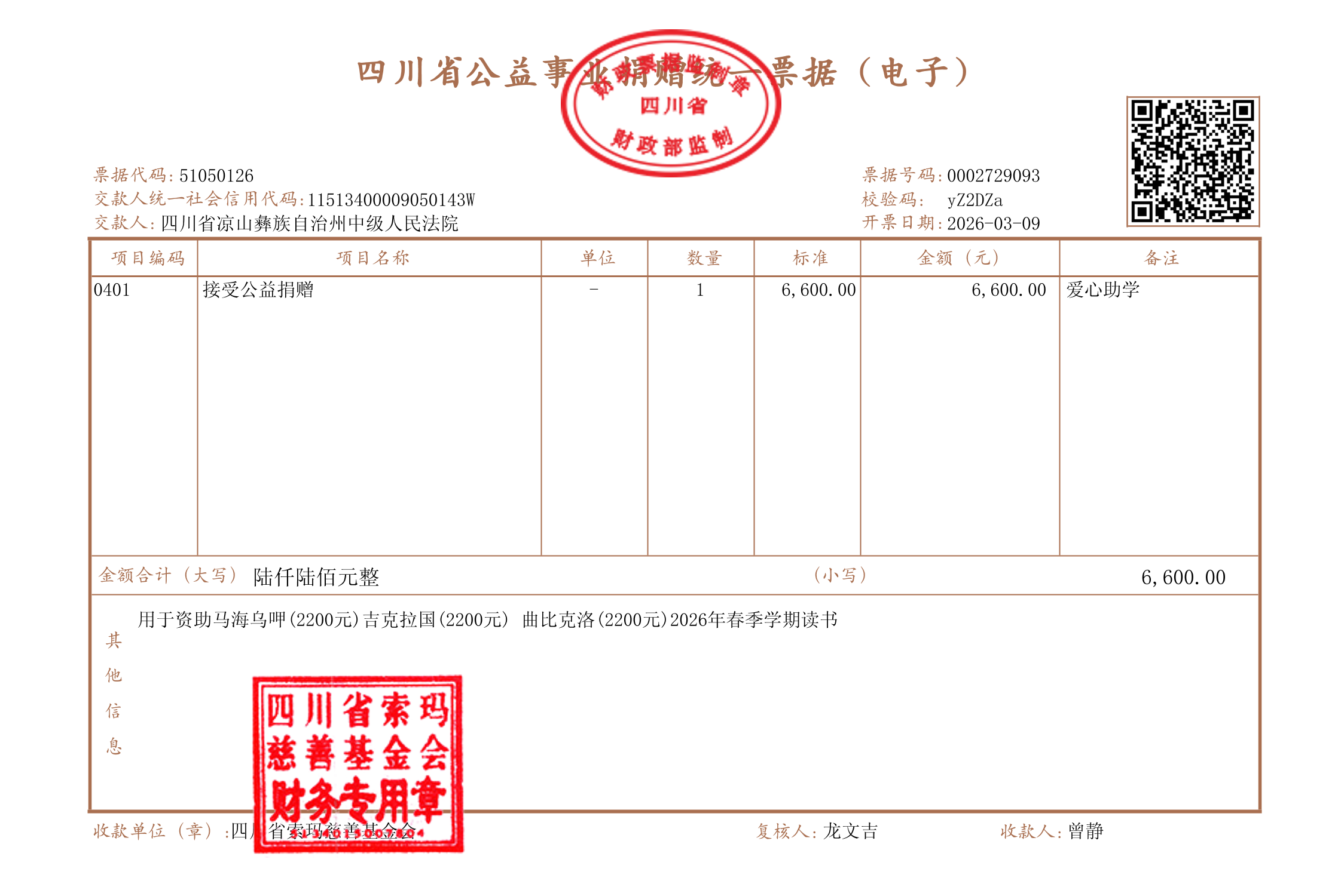 | 3月17日收到 | 四川省凉山彝族自治州中级人民法院 | 爱心助学 | ¥6,600.00 | 自助马海乌呷和吉克拉国和曲比克洛等 |