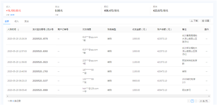 | 5月20日收到 | 刘正东 | 爱心助学 | ¥9,900.00 | 暑假资助两个初中两个高中生第二年费用 |