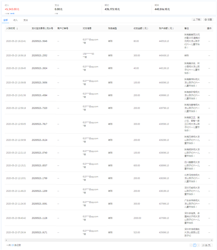 | 5月23日收到 | 许勤 | 索玛花支教 | ¥20.00 | 20元祝大凉山孩子们六一儿童节快乐! |