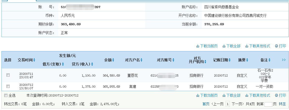 | 7月12日收到 | 董恩花 | 爱心助学 | ¥1,100.00 | 石一石布2020-2021学年学费 |