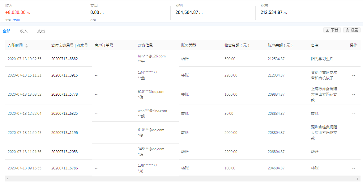 | 7月13日收到 | 深圳余桂良 | 索玛花支教 | ¥2,000.00 | 捐赠大凉山索玛花支教 |