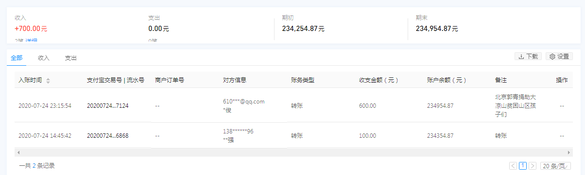 2020年7月24日接收捐赠的信息