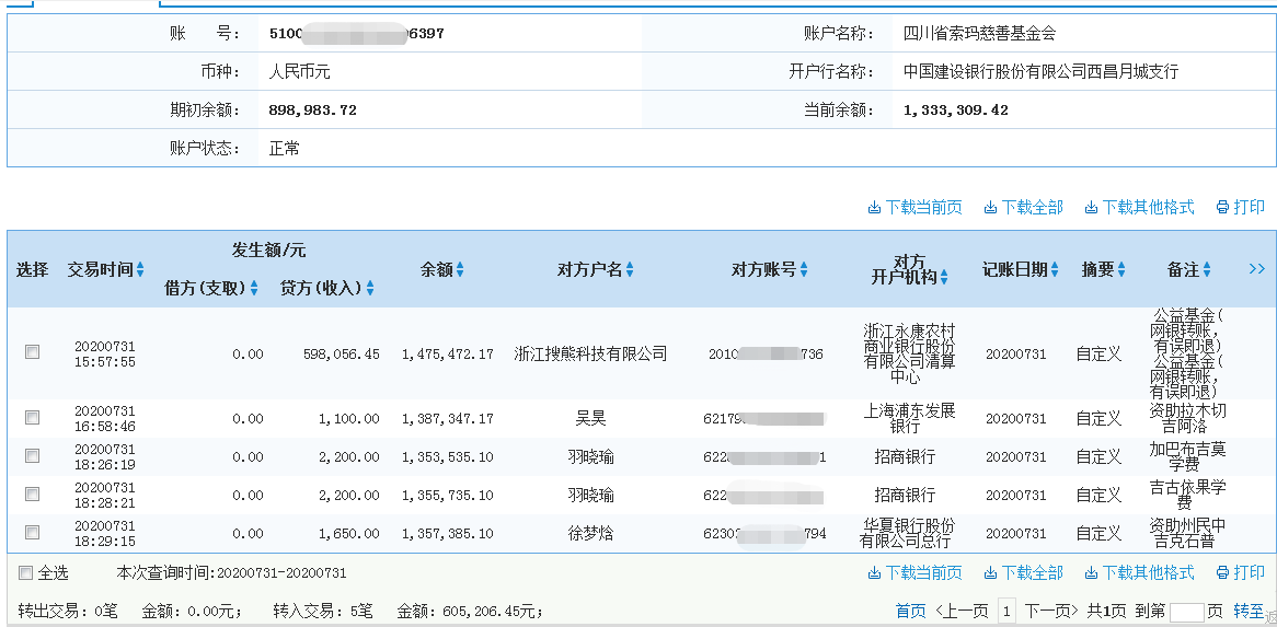 | 7月31日收到 | 浙江搜熊科技有限公司 | 爱心建校 | ¥598,056.45 | 公益基金(网银转账,有误即退) |