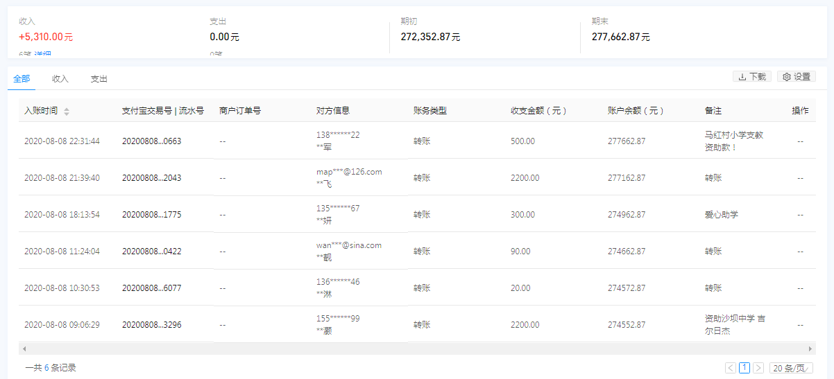 | 8月8日收到 | **淋 | 爱心捐款 | ¥20.00 | 支付宝暂未开票 |