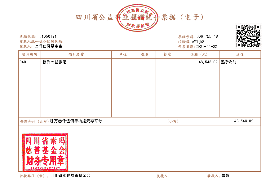 | 5月24日收到 | 上海仁德基金会 | 医疗救助 | ¥43,548.02 | 腾讯-大山春天计划 |
