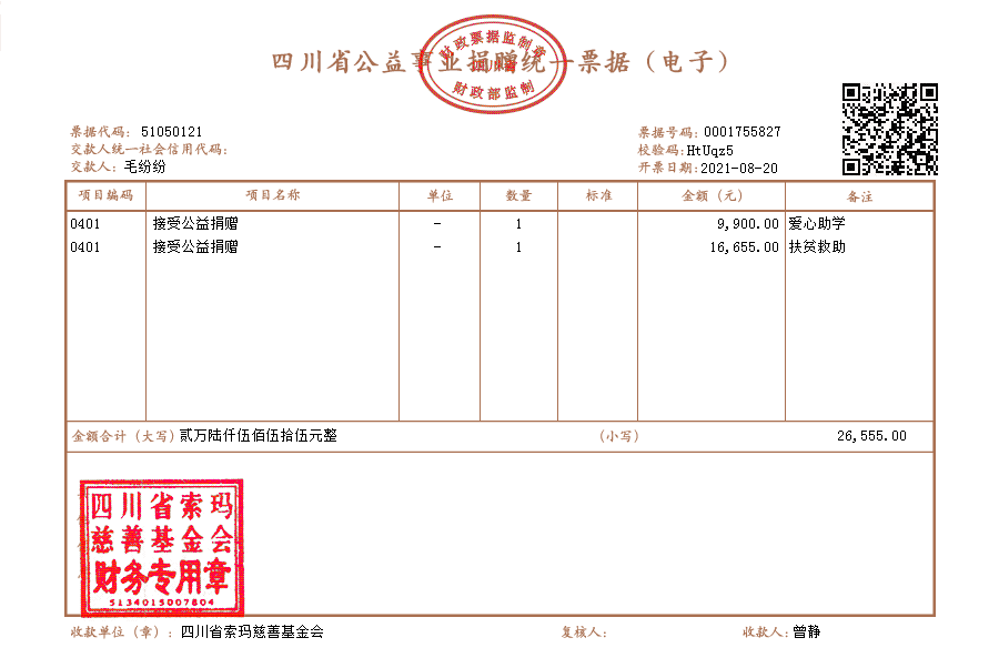 | 8月19日收到 | 毛纷纷 | 扶贫救助 | ¥16,655.00 | |