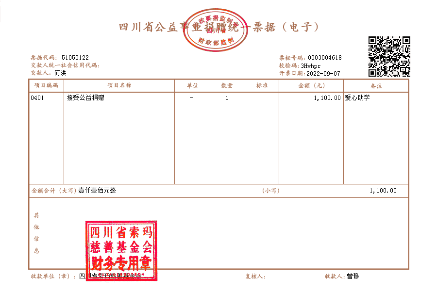 | 9月5日收到 | 李国隆 | 爱心捐款 | ¥5.00 | 暂未开票 |