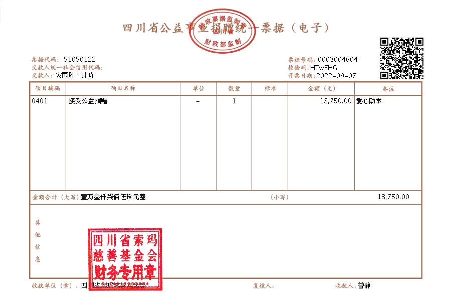 | 9月5日收到 | 安国胜、康瑾 | 爱心助学 | ¥13,750.00 | 资助 美姑中学西昌校区 吉克尔达 海来石节 的莫作里 西昌二中 王文璟 甲拉石西 已汇款,执行费1250 |