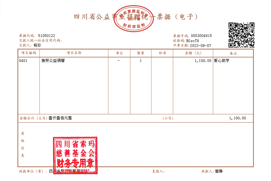 | 9月5日收到 | 杨珍 | 爱心助学 | ¥1,100.00 | 资助尔其约其拉子 |