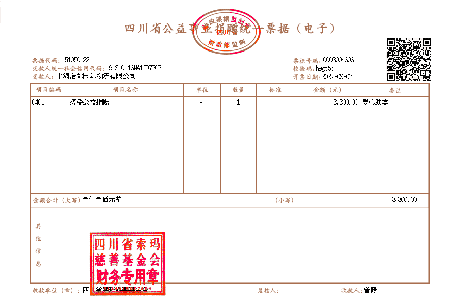 | 9月5日收到 | 上海浩弥国际物流有限公司 | 爱心助学 | ¥3,300.00 | 91310116MA1J977C71,资助拉马惹机依洛、个案惹机木洛,执行费300 |