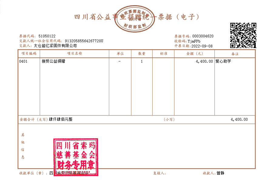 | 9月6日收到 | 太仓超亿紧固件有限公司 | 爱心助学 | ¥4,400.00 | 91320585564267720U资助昭觉县东晨中学阿的吉吉、樟木中学吉木有星 |